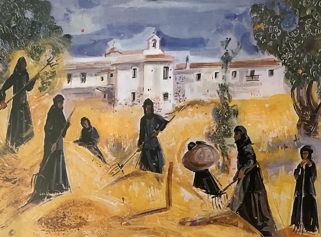 Εικόνα.1: Όλες οι δουλειές δίνουν χαρά στ’ άξια χέρια (Καλόγριες της Μονής Καλτετζών σε αγροτική εργασία, αναδημοσίευση από: Ντιάνας Αντωνακάτου – Τάκη “Μαύρου, Ελληνικά Μοναστήρια Πελοπόννησος , τόμος Β΄ , Αρκαδία, Αθήνα 1979, σ. 87).