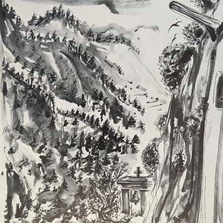 Εικόνα 2: ΄Αποψη του τοπίου της Μονής Μπεζενίκου, πενάκι, ασπρόμαυρο (αναδημοσίευση από : Ντιάνας Αντωνακάτου – Τάκη Μαύρου, Ελληνικά Μοναστήρια Πελοπόννησος , τόμος Β΄ Μονές Αρκαδίας, Αθήνα 1979, σ. 69).